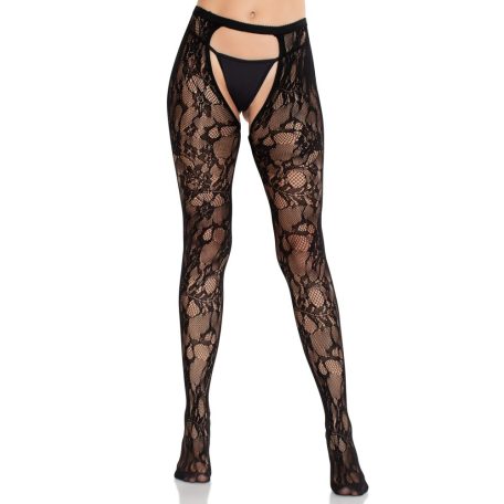 Rose Lace Crotchless Tights with Open Back - Black O/S